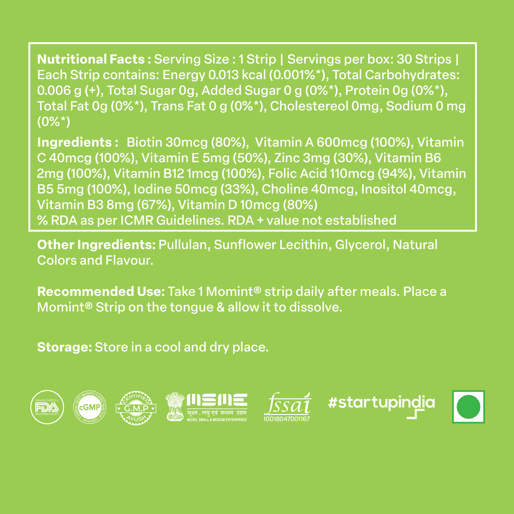 Momints Hair Care Strips are designed to deliver key nutrients that support hair health and vitality. Packed with nature-sourced Sesbania extract, they help strengthen hair follicles, reduce hair loss, and enhance shine and texture. Convenient and easy to use, the Biotin and Zinc promote scalp health and improve hair thickness, making them an ideal addition to your daily wellness routine.
